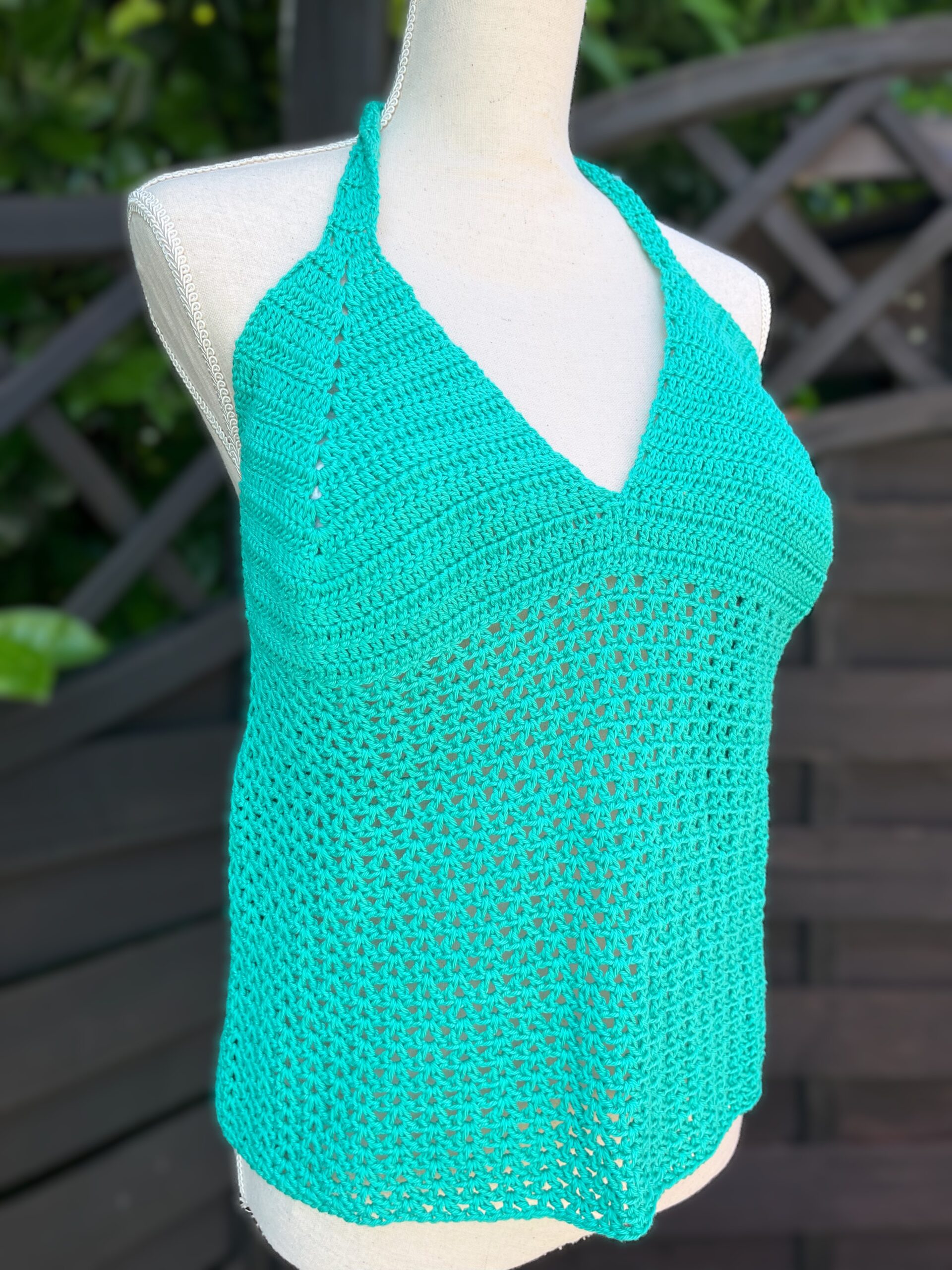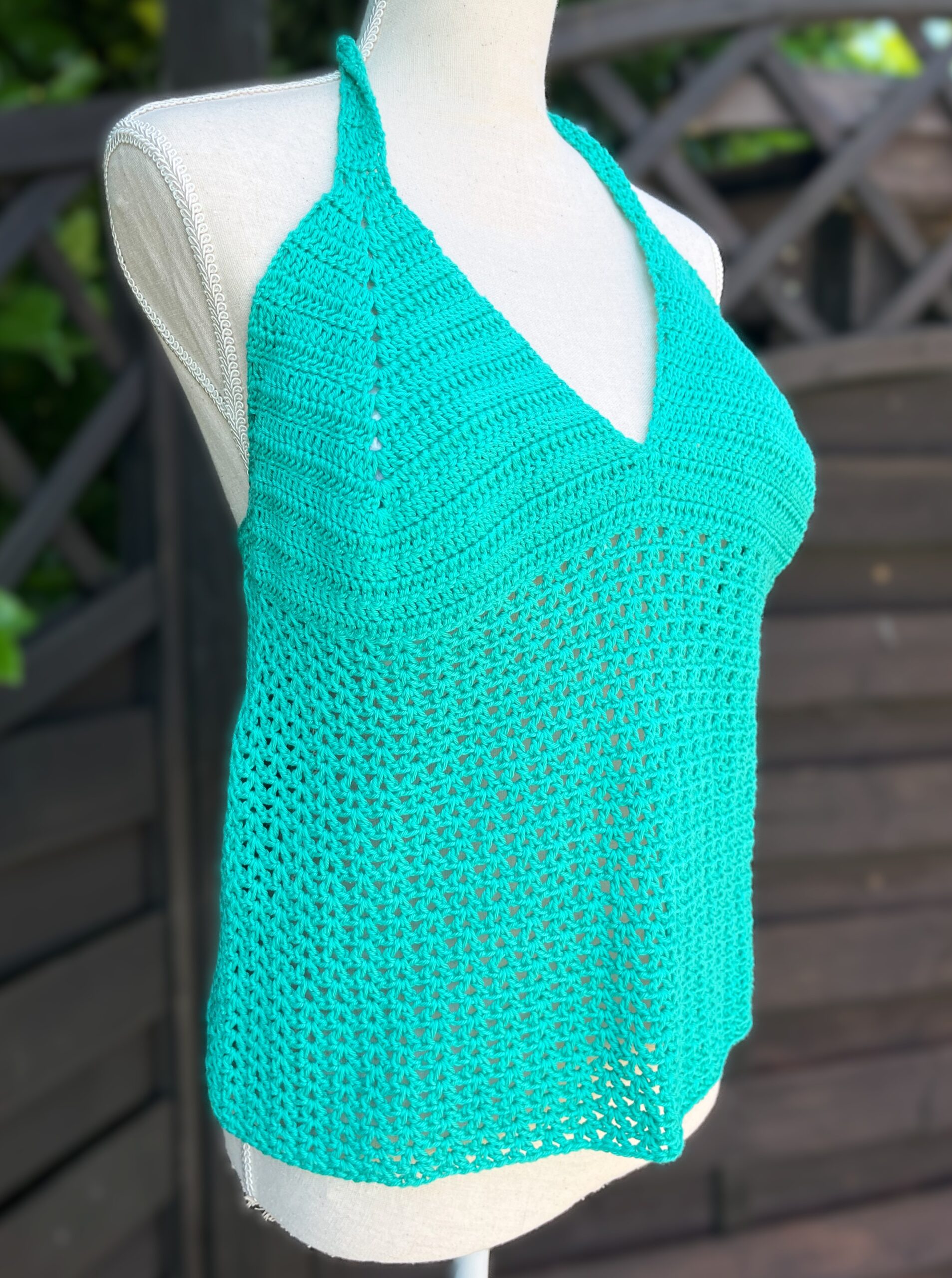 Ročno kvačkan top iz 100 % bombažne preje v zeleni barvi. Velikost M/L, nastavljiv, udoben in popoln za poletje. Trajnostna in unikatna izbira za vsakdanji videz.