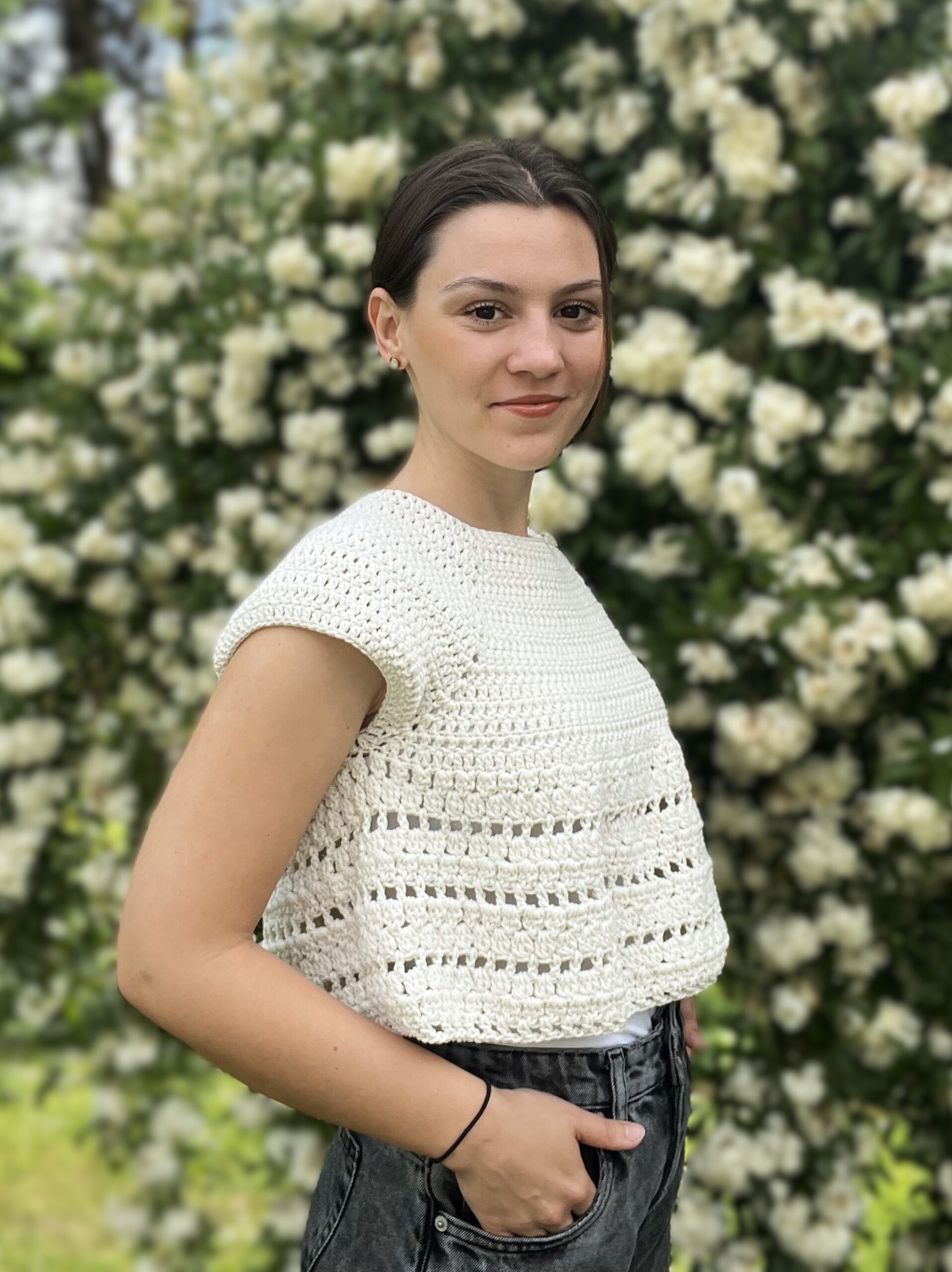 Top Bella je zračen, eleganten in ročno kvačkan s skrbno izbranimi detajli. V naravno beli barvi ter s klasičnim krojem, se popolno prilega telesu in doda ženstven pridih vsakemu poletnemu outfitu. Odličen za sproščene popoldneve, mestne sprehode ali festivalske dni – Bella združuje udobje in stil v enem unikatnem kosu.
