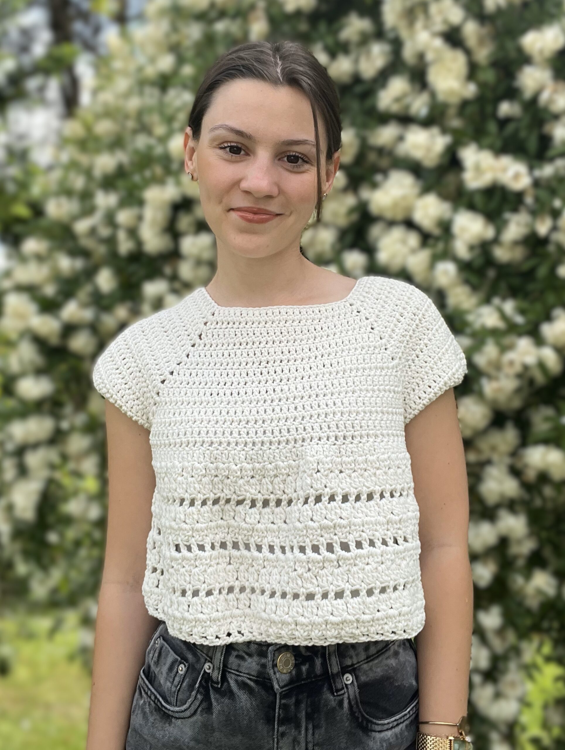 Top Bella – ročno kvačkan poletni top v naravno beli barvi. Unikatna ročna izdelava, lahkoten in eleganten videz. Popoln za tople dni.