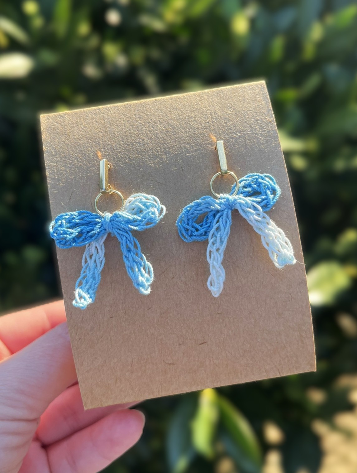 Nežni kvačkani uhani v obliki mašnic iz svetlo modre prelivajoče se preje z zlato osnovo. Lahki, igrivi in unikatni uhančki.