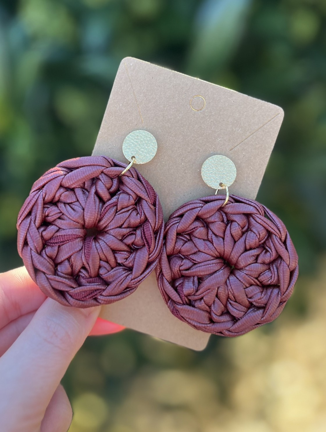 Elegantni kvačkani uhani v bordo rdeči barvi z videzom usnja in zlato okroglo osnovo. Lahki, sofisticirani in izraziti.