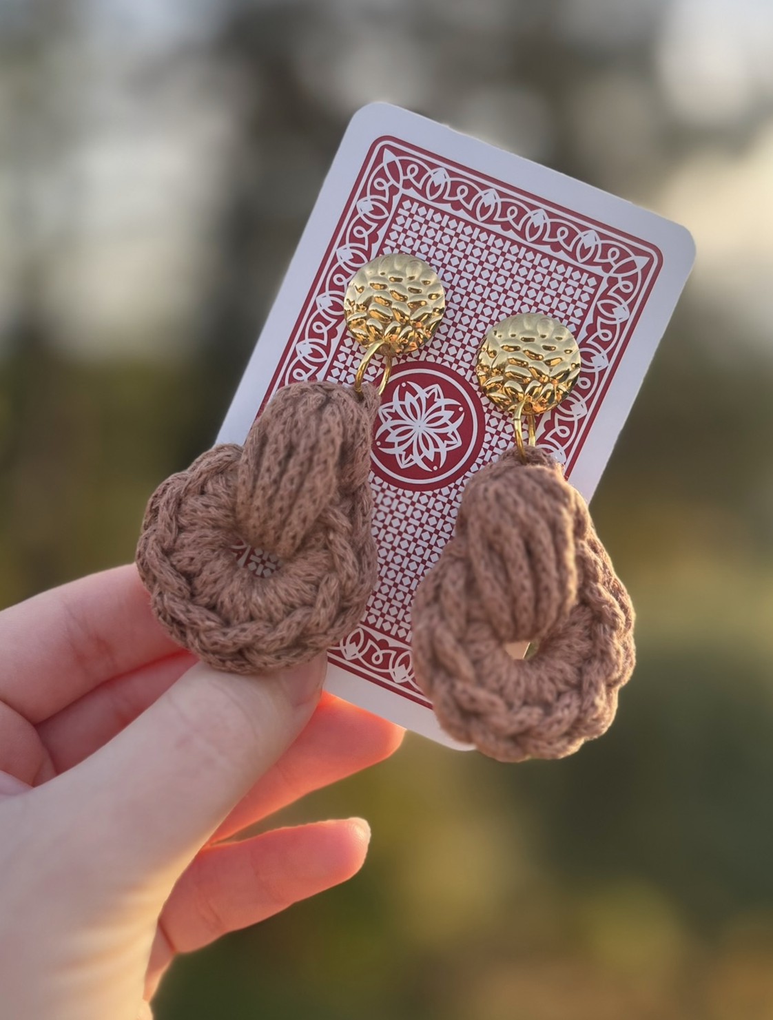 Ročno izdelani kvačkani uhani Bria v rjavi barvi na zlati okrogli osnovi. Elegantni, lahki in popolni za vsakodnevno ali večerno nošenje.