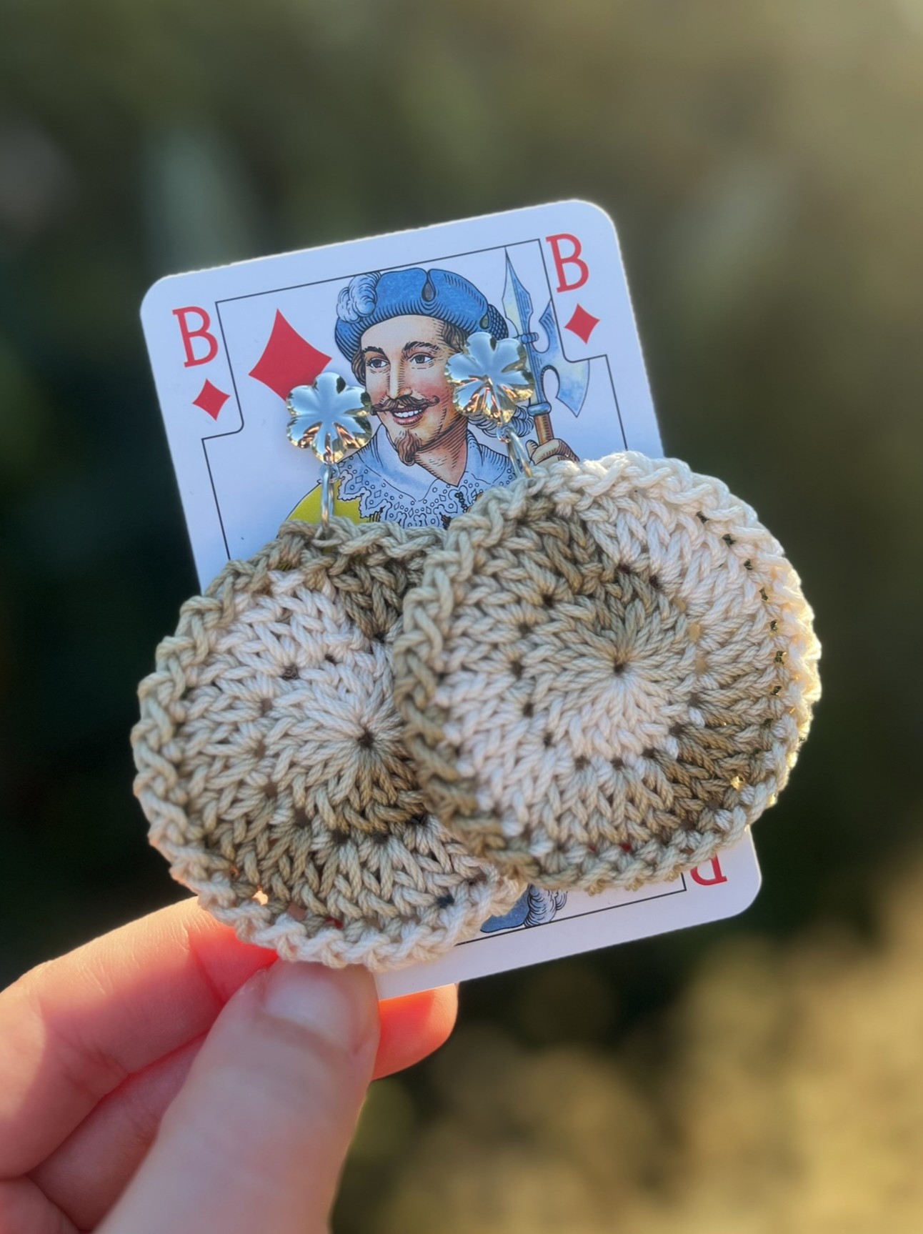 Earthy Glow kvačkani uhani so ročno izdelani uhančki v čudovitih bež, zelenih in rjavih prelivajočih se tonih, ki ustvarjajo naraven in harmoničen videz. Njihova krožna oblika s poudarjeno teksturo daje uhanom mehkobo in subtilno izraznost.