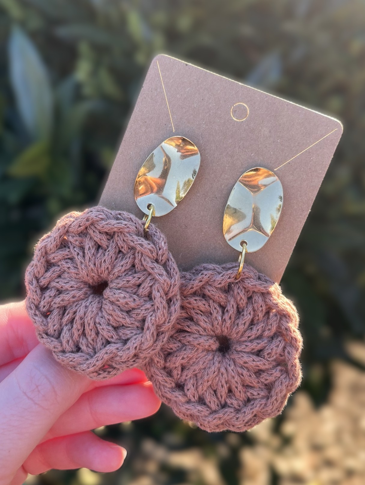 Elegantni kvačkani uhani v toplih rjavih tonih z zlato ovalno osnovo. Lahki, sofisticirani in vsestranski uhančki.