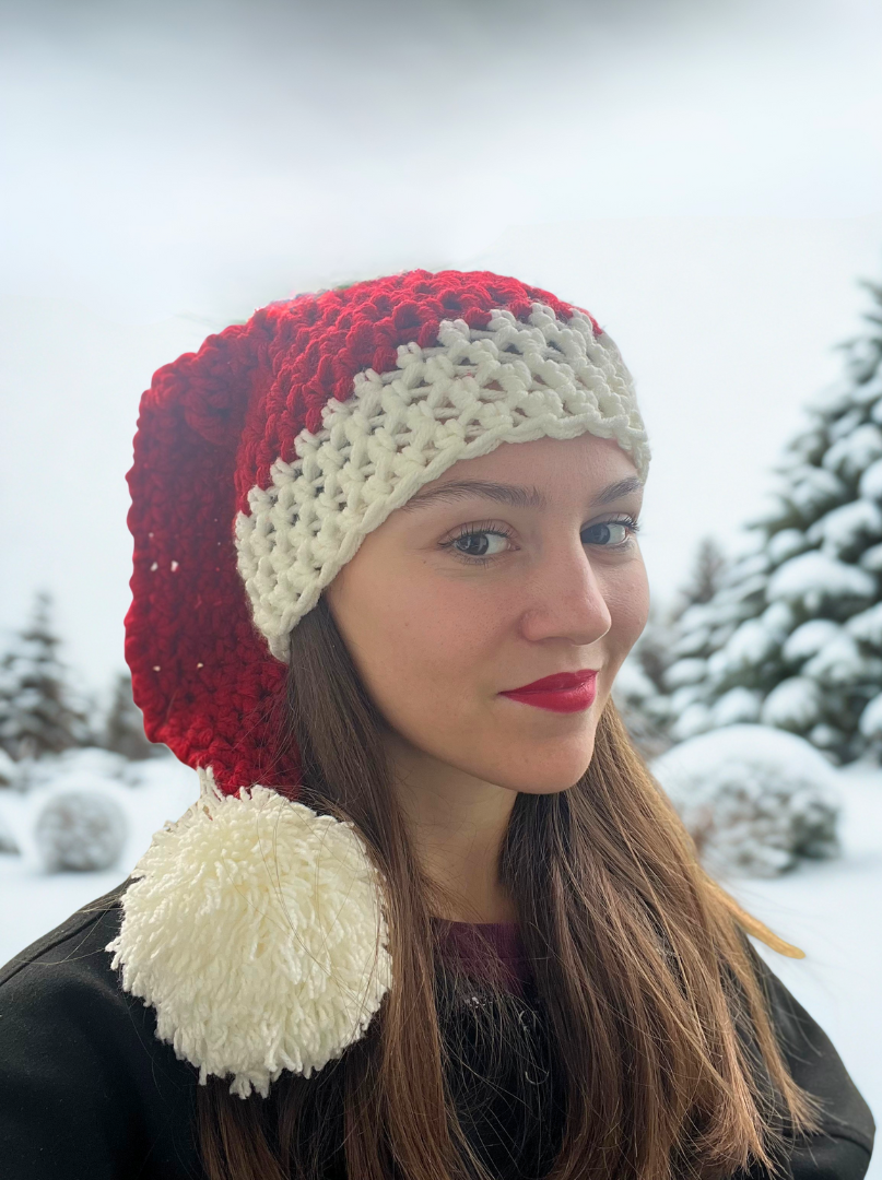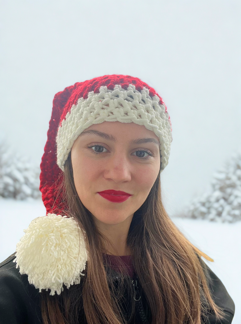 Ročno kvačkana božična kapica. Mehka, topla in popolna za praznične fotografije, darila ali čarobne decembrske trenutke. UNI velikost (raztegljiva, tako da je primerna za ženske in moške).