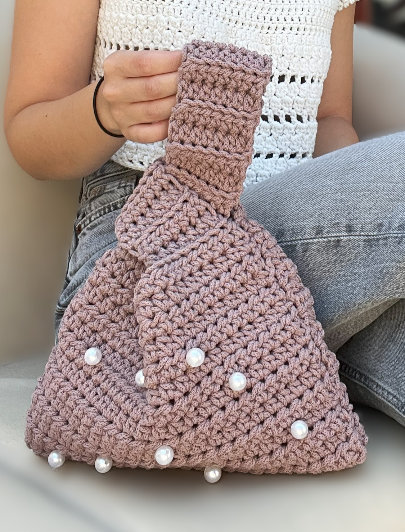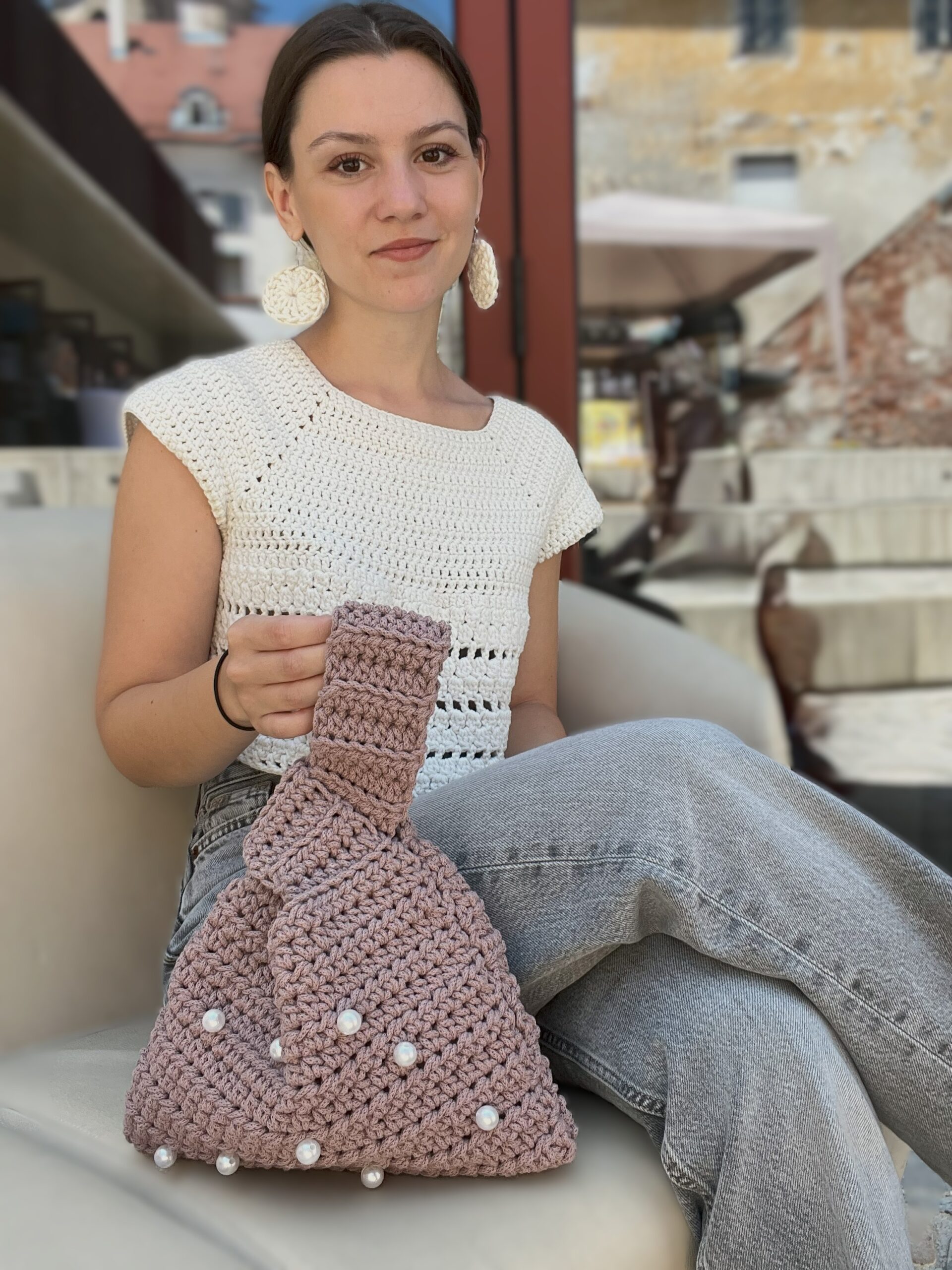 Ročno kvačkana torbica z ročaji in perlami iz reciklirane preje. Nežno roza torbica za romantičen in trajnosten modni slog. Ročno izdelano v Sloveniji.