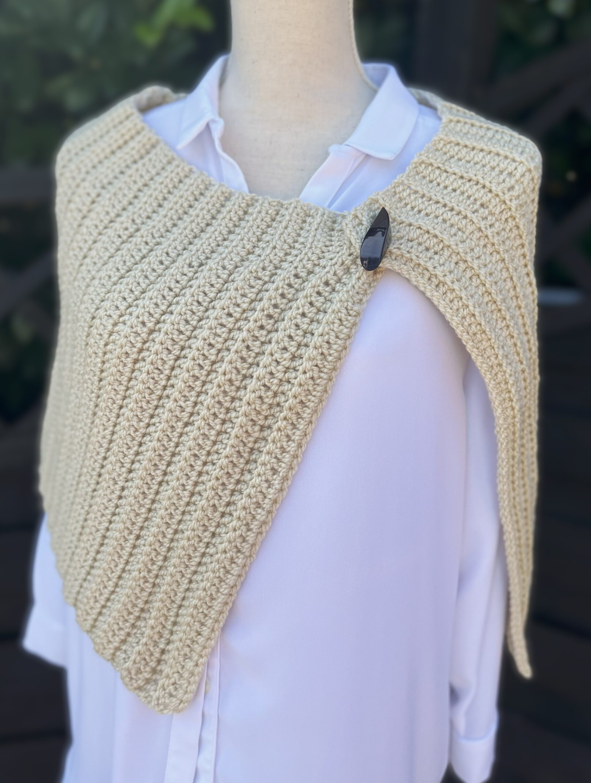Pončo Liora je ročno kvačkan iz mehke preje v brezčasnem bež odtenku, ki se odlično ujema z vsako garderobo. Elegantna asimetrična oblika in izrazita rebrasta tekstura pončotu dodajata sodoben videz, okrasni gumb pa ga drži na mestu in hkrati služi kot modni detajl.
