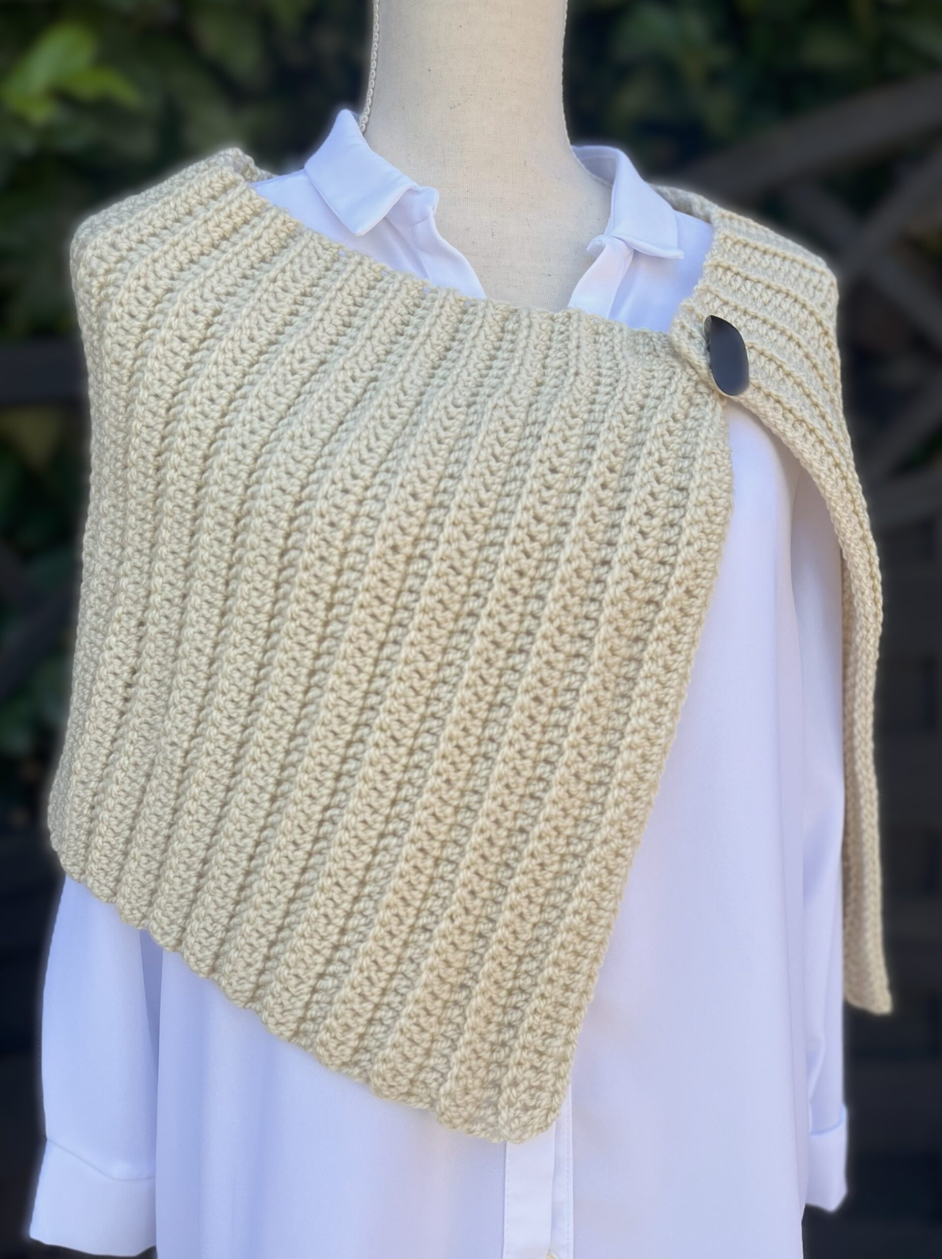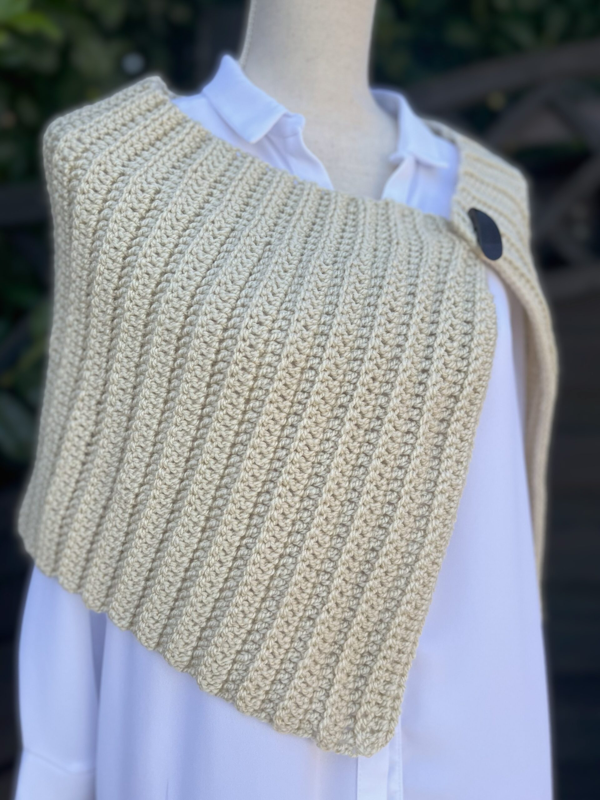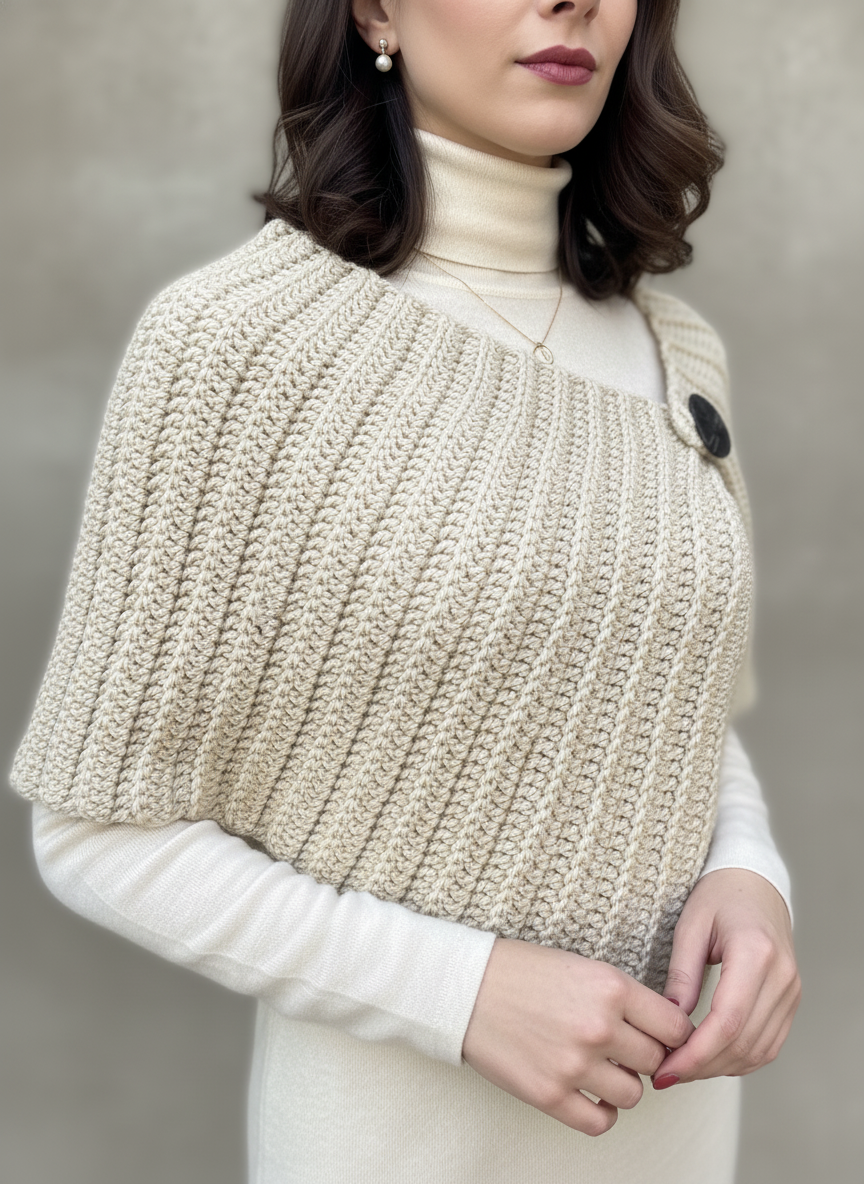 Ročno kvačkan pončo Liora v elegantnem bež odtenku. Mehka tekstura, asimetrična oblika in okrasni gumb ustvarjajo brezčasen videz. Unikaten kos za prehodne in hladnejše dni.