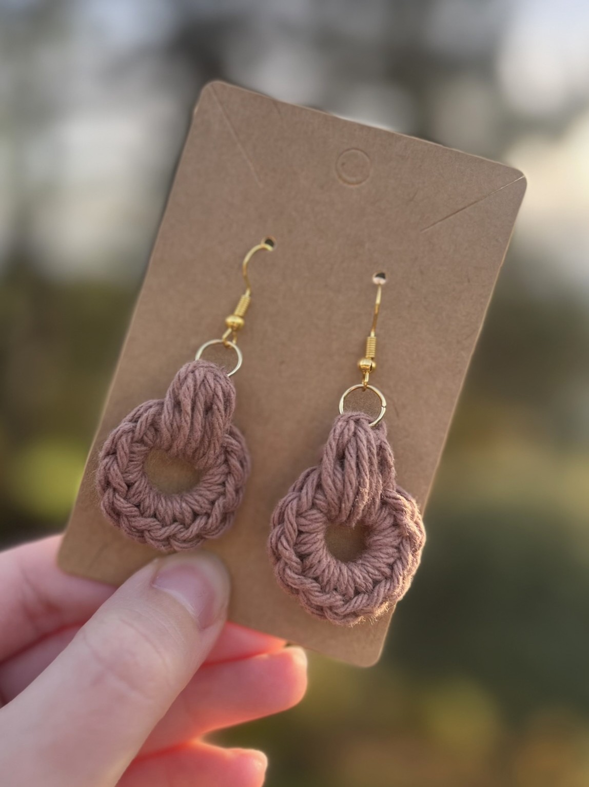 Ročno izdelani kvačkani uhani Luna v rjavi barvi s prepletenim krogom na zlati osnovi. Elegantni, lahki in popolni za vsak dan.