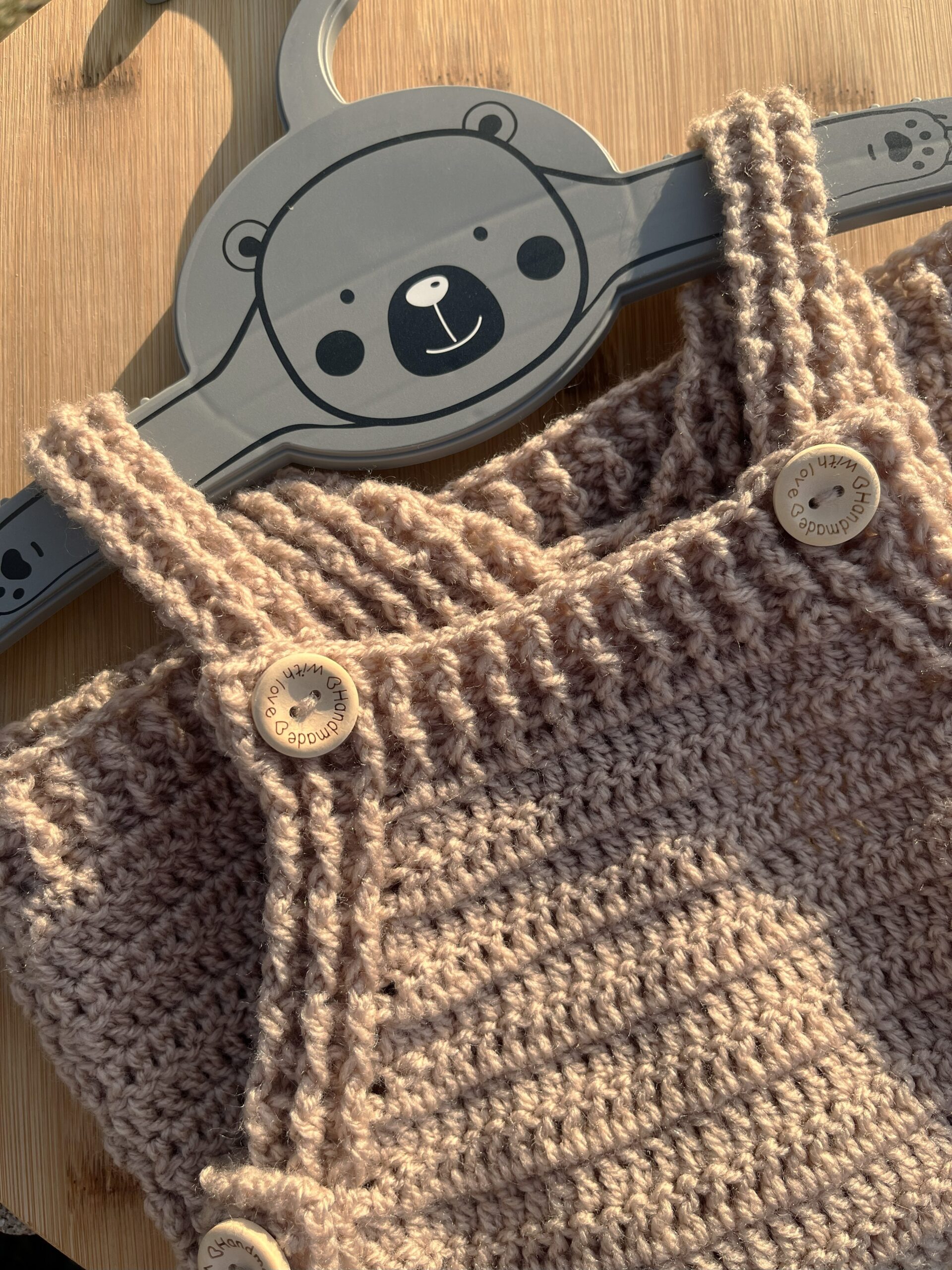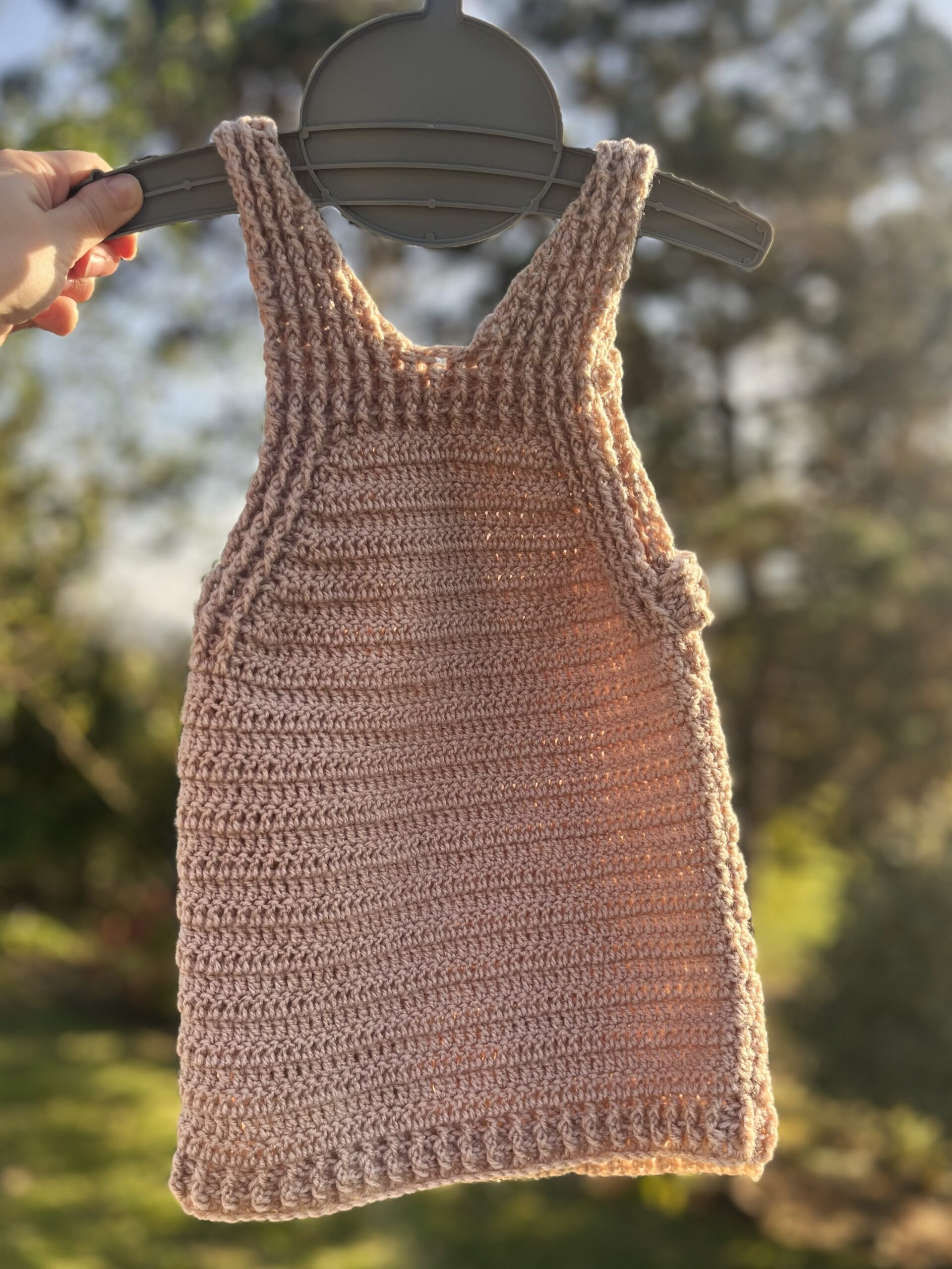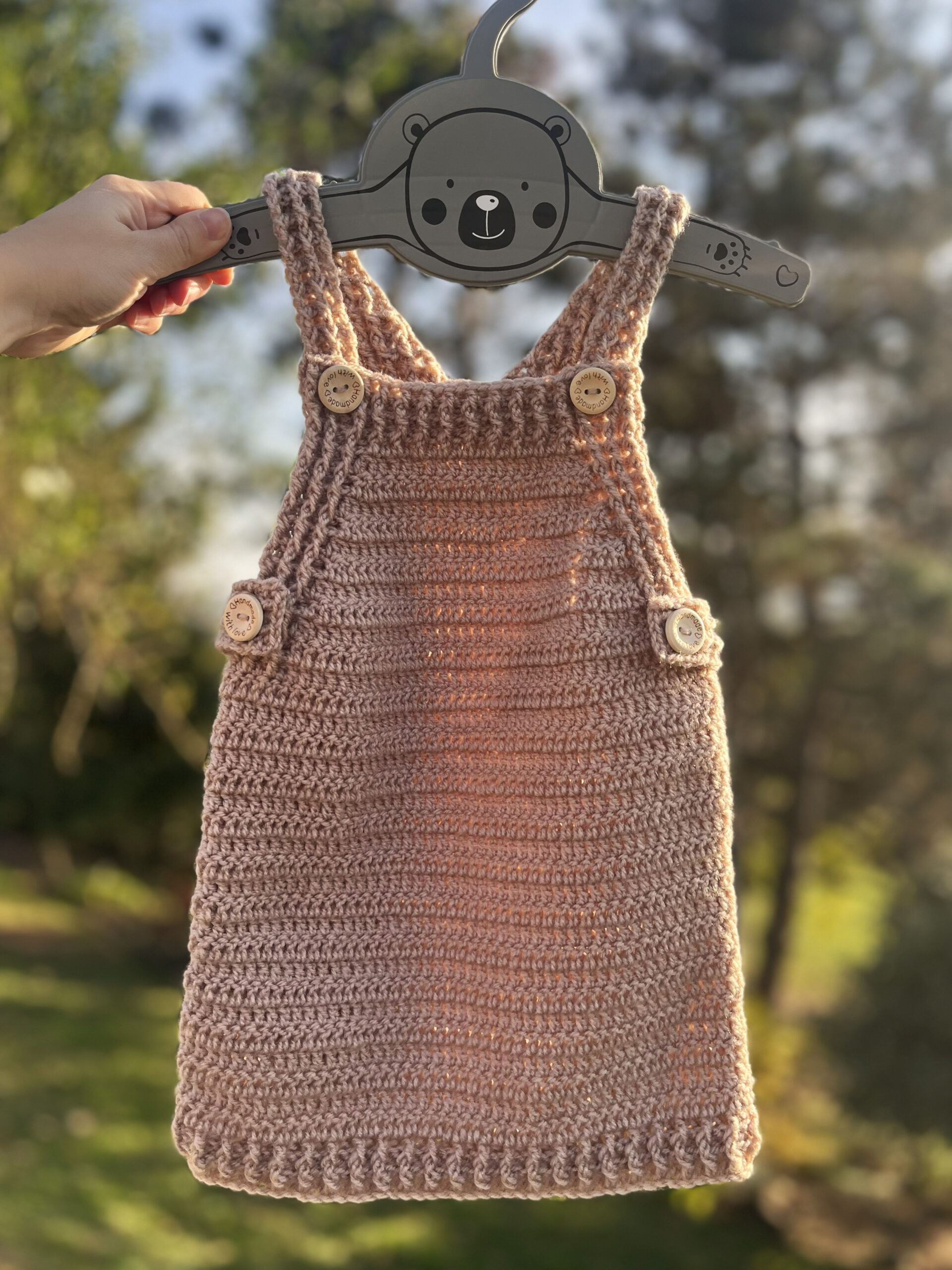 Ročno izdelana kvačkana oblekica Mila v nežni bež barvi. Mehka, udobna in popolna za deklice stare 12–18 mesecev.