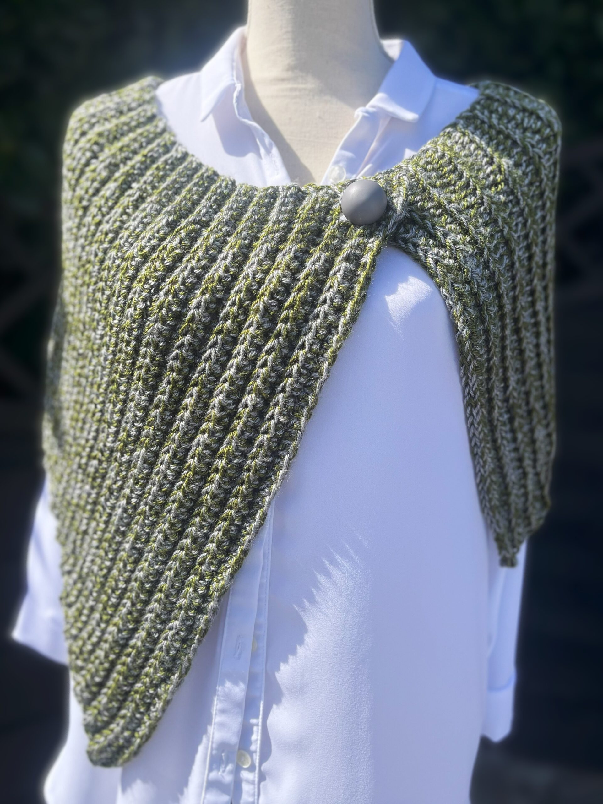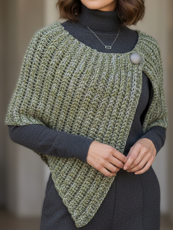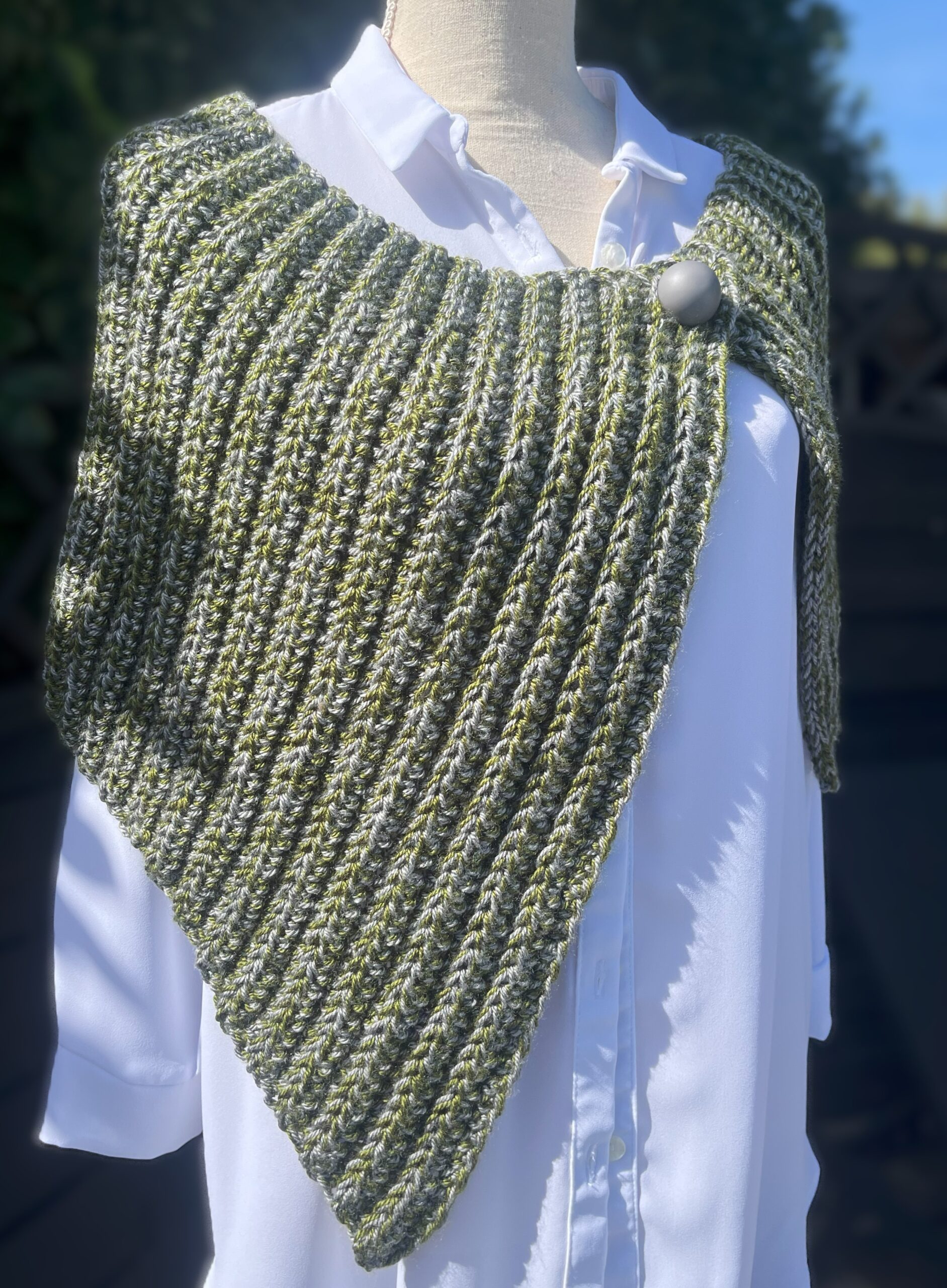 Ročno kvačkan pončo Olivia v odtenkih zelene in sive barve. Elegantna asimetrična oblika z gumbom za zapenjanje, popoln za hladnejše dni.