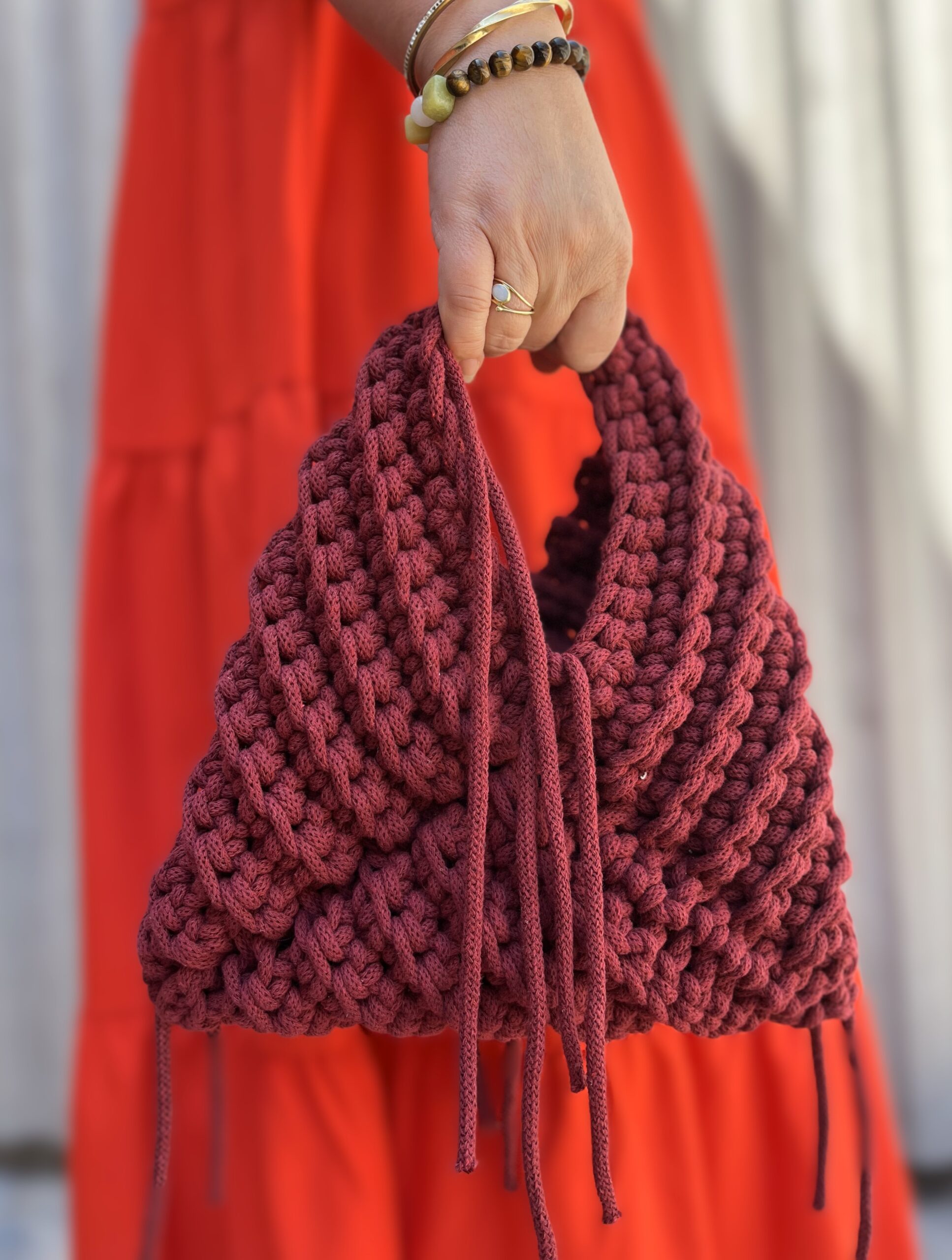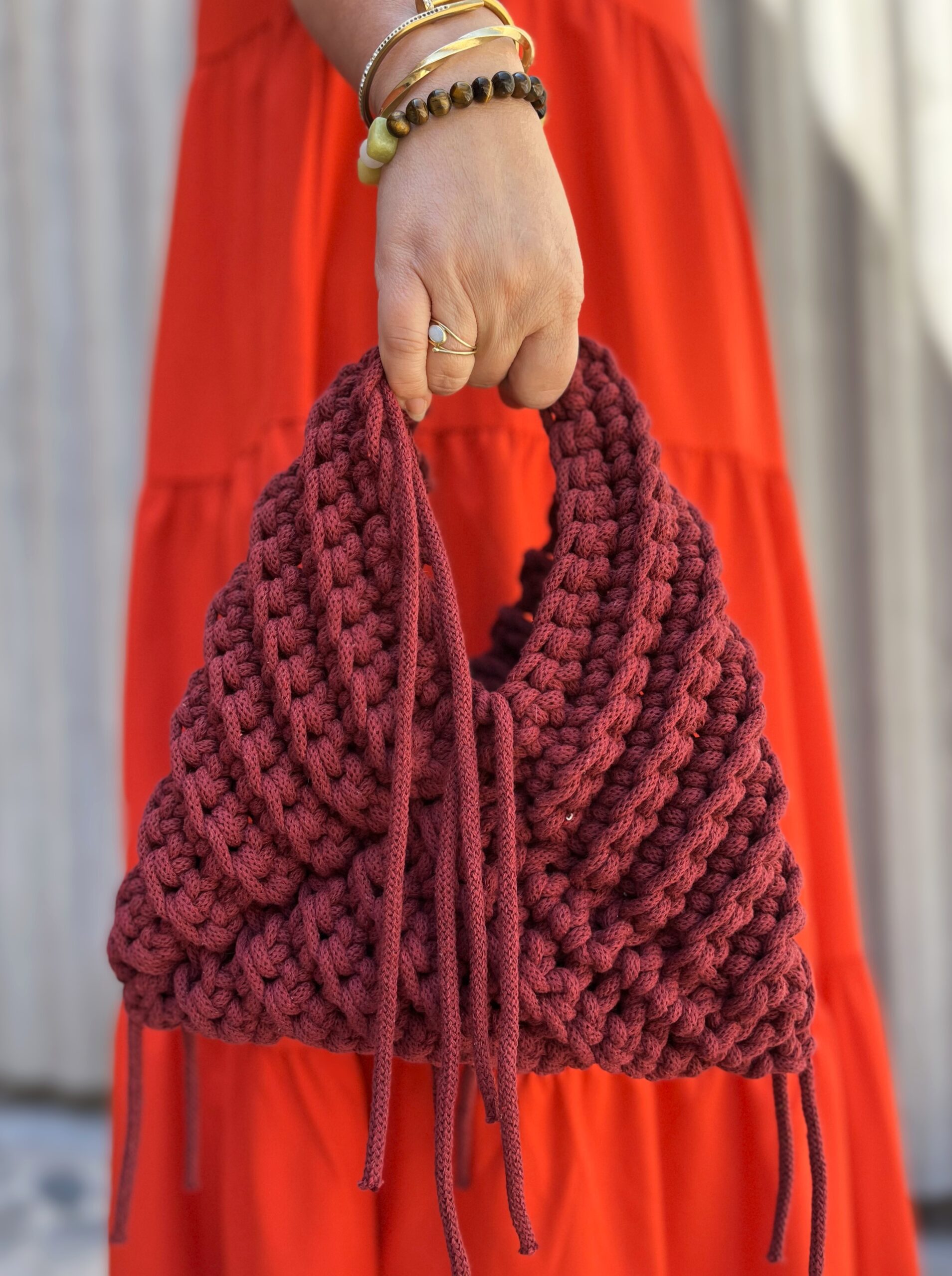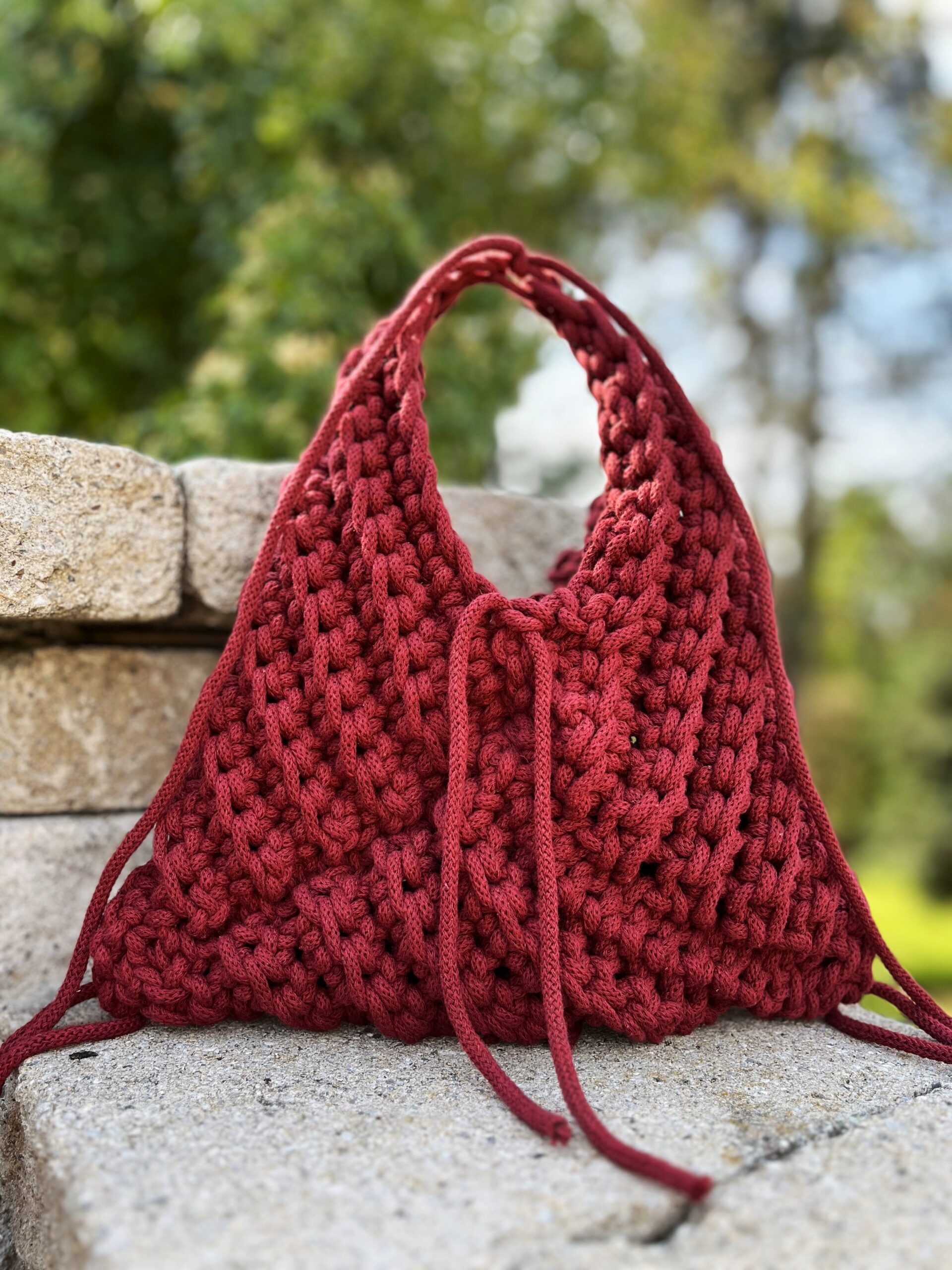 Ročno kvačkana rubinasto rdeča torbica iz reciklirane preje. Edinstvena, trajnostna in moderna izbira za vsak dan. Ročno izdelano v Sloveniji.