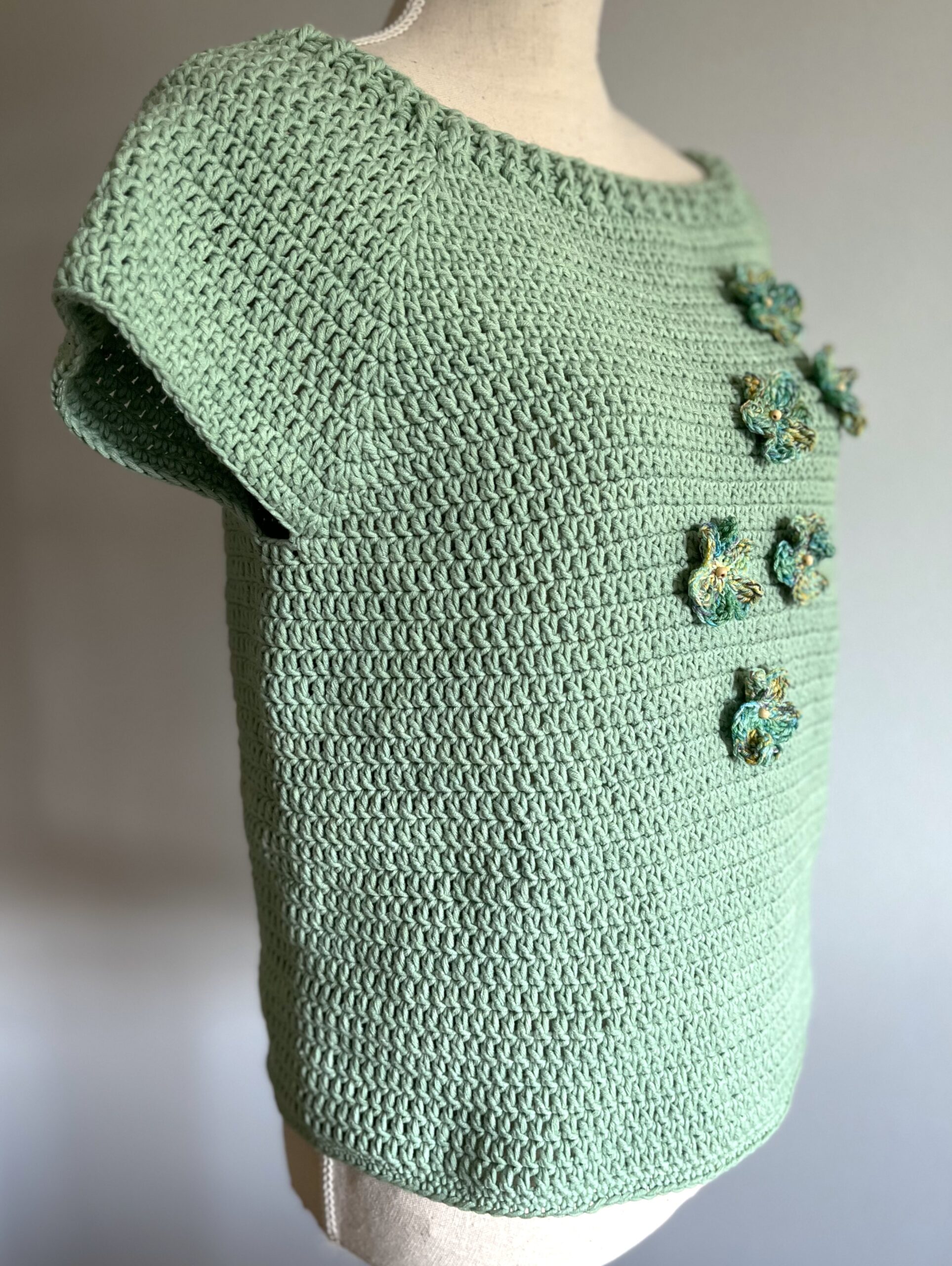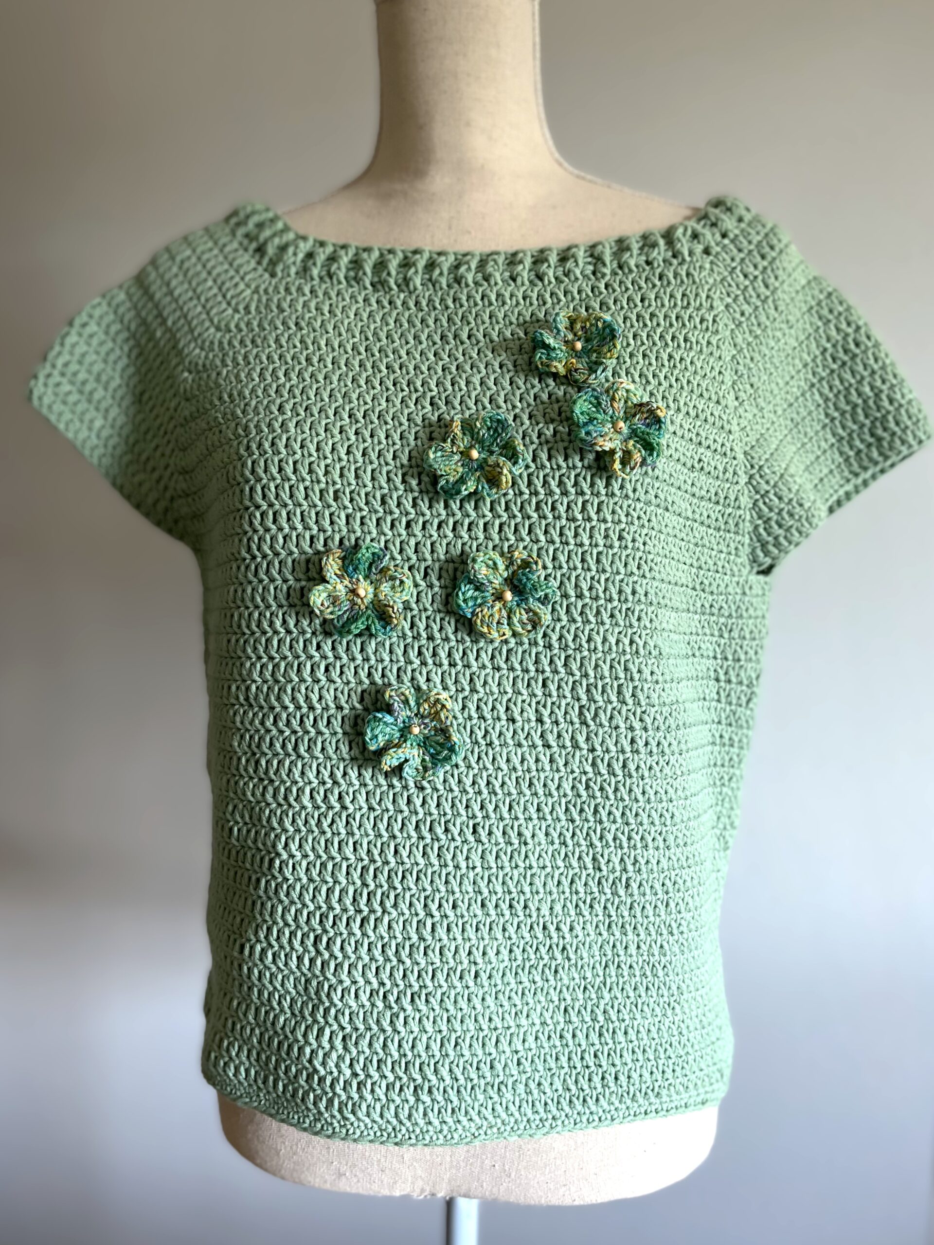 SMARAGD je ročno kvačkan top, ki združuje naravno lepoto, nežno barvno paleto in tradicionalno ročno spretnost. V zeleni barvi, okrašen s šestimi unikatnimi rožicami, izžareva ženstvenost, lahkotnost in brezčasen stil.