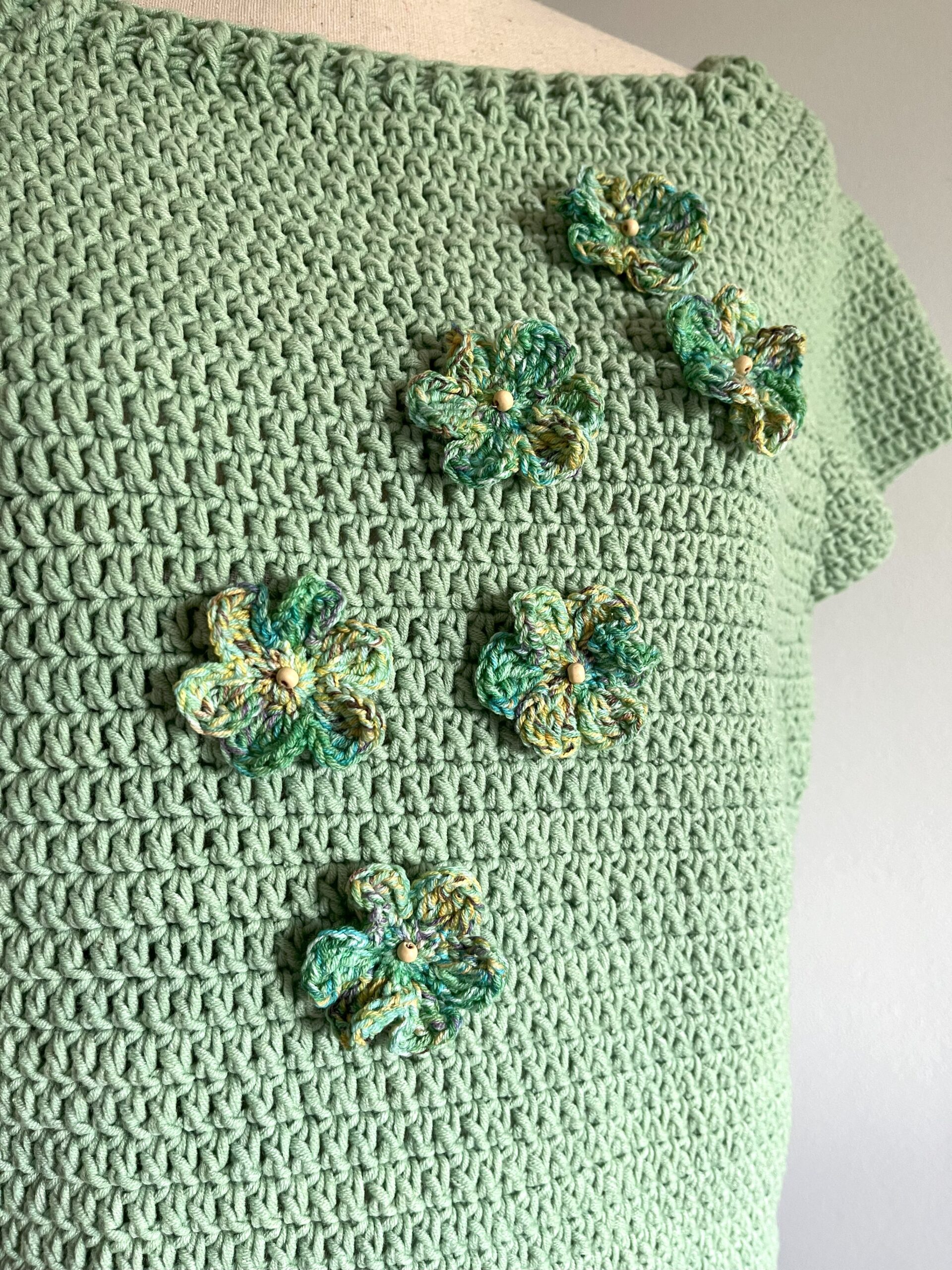Unikaten poletni kos v zeleni barvi, okrašen s 6 ročno kvačkanimi cvetovi. Narejen iz 100 % bombaža, zračen in prijeten za nošenje. Ročno izdelano z ljubeznijo v Sloveniji. 💚