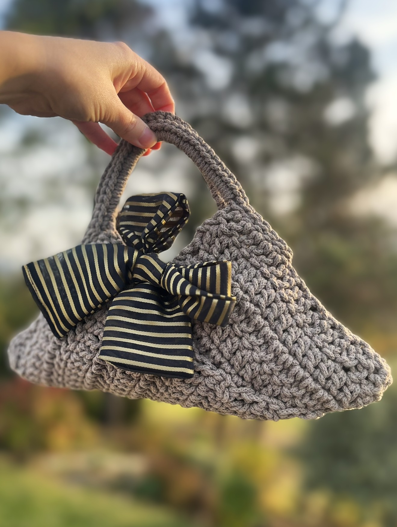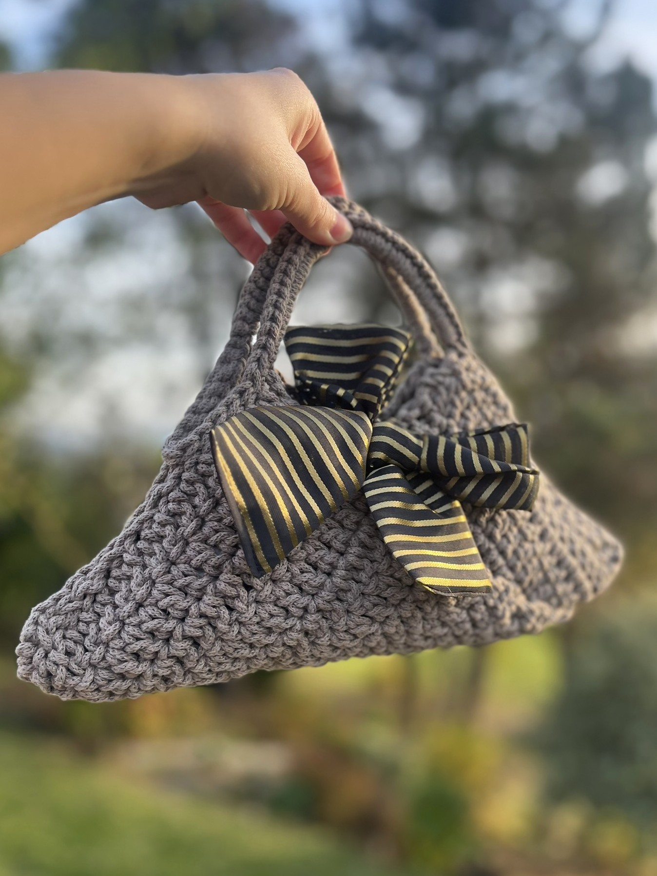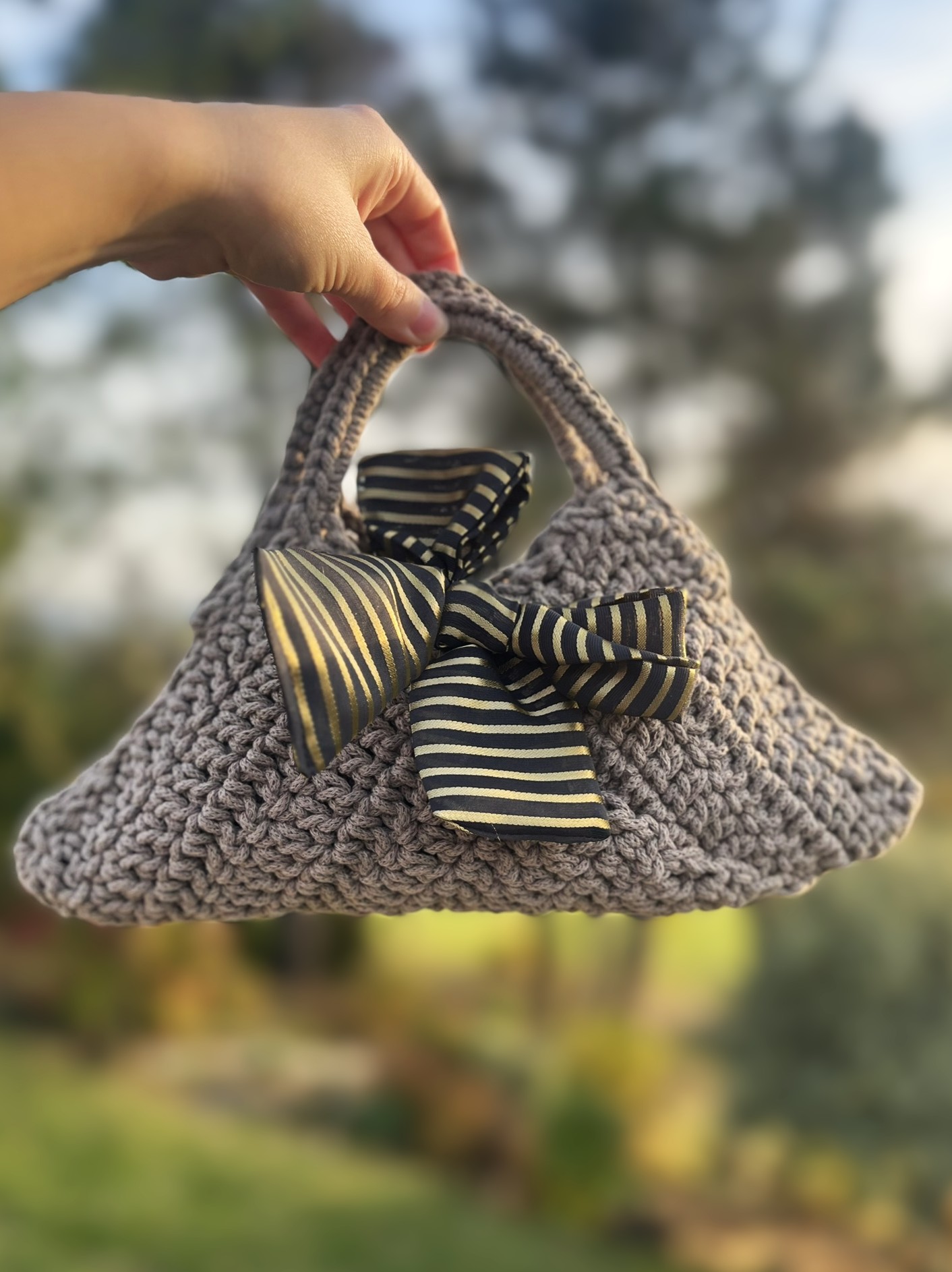 Ročno izdelana trikotna torbica Trina v sivo-rjavi barvi z zlato-črno mašno. Elegantna mini torbica za posebne priložnosti ali vsak dan.