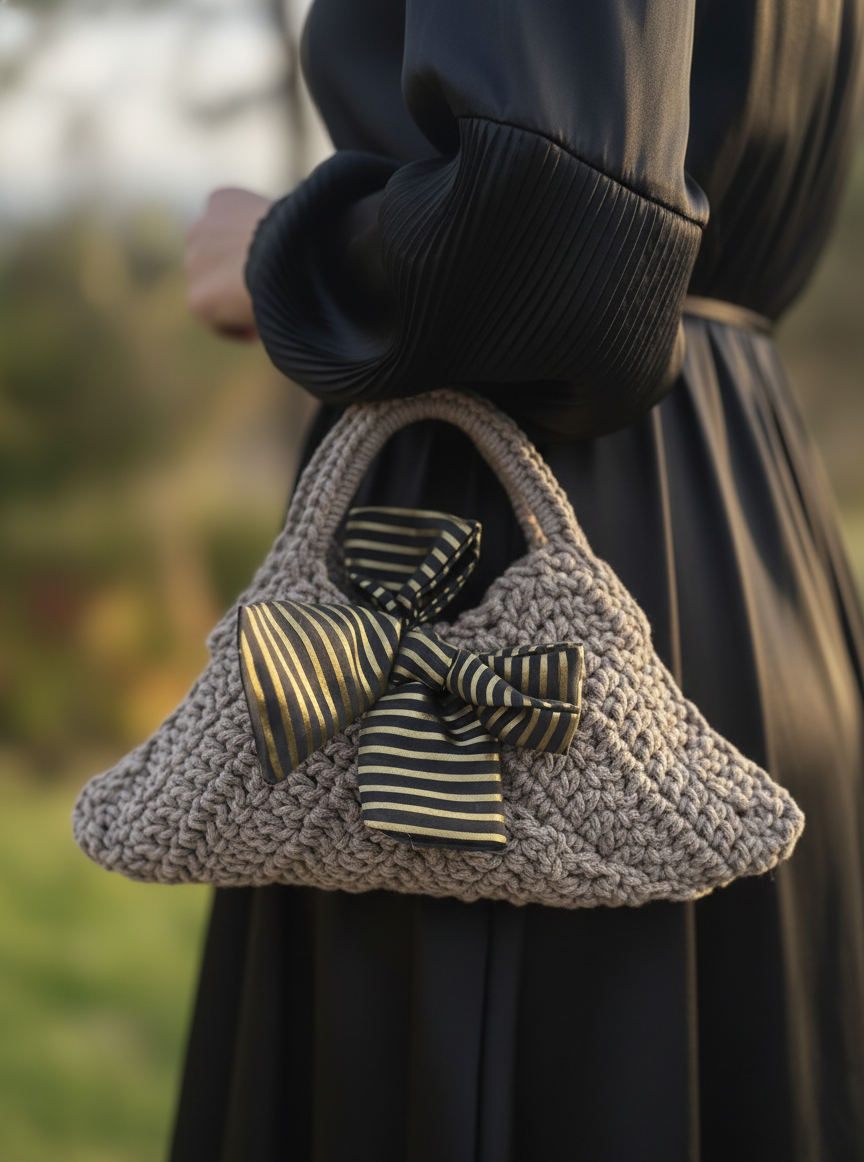 Prepusti se čaru unikatnih modnih dodatkov z trikotno kvačkano torbico Trina, ki združuje sodoben dizajn in romantičen poudarek. Njena sivo-rjava barva je izjemno vsestranska, elegantna in primerna za vse letne čase, medtem ko zlato-črna mašna doda prepoznaven, glamurozen zaključek.